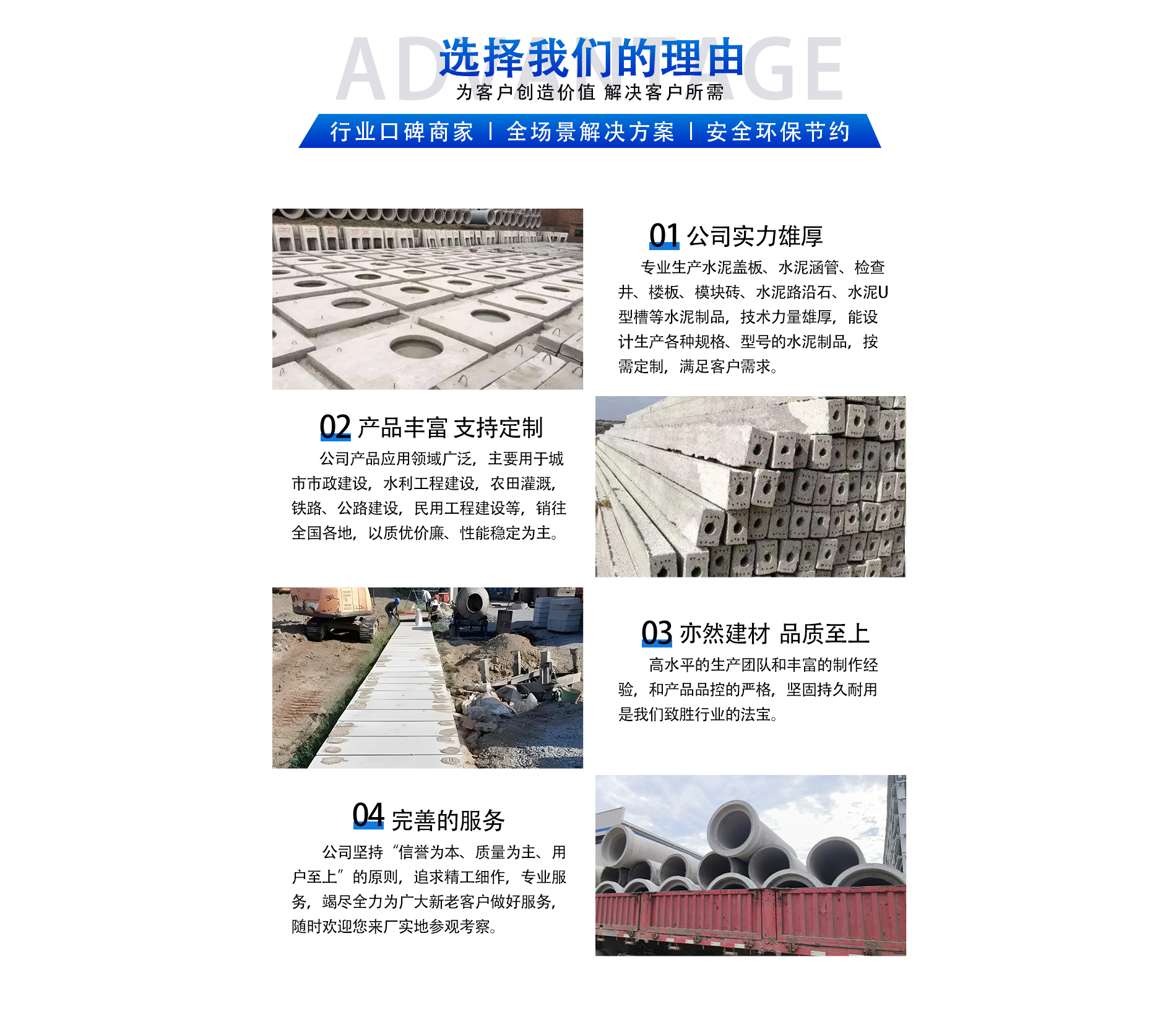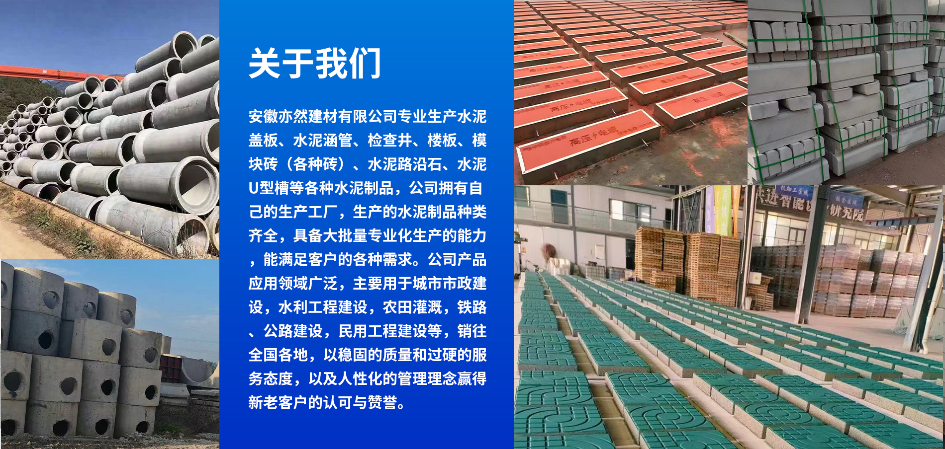安徽亦然建材有限公司專業(yè)生產(chǎn)水泥涵管、水泥蓋板、檢查井、路沿石、水泥U型槽等各種水泥制品,公司技術(shù)先進(jìn),能設(shè)計(jì)、生產(chǎn)各種規(guī)格、型號(hào)的水泥制品,按需定制,滿足客戶需求,公司實(shí)力雄厚,加工設(shè)備齊全。